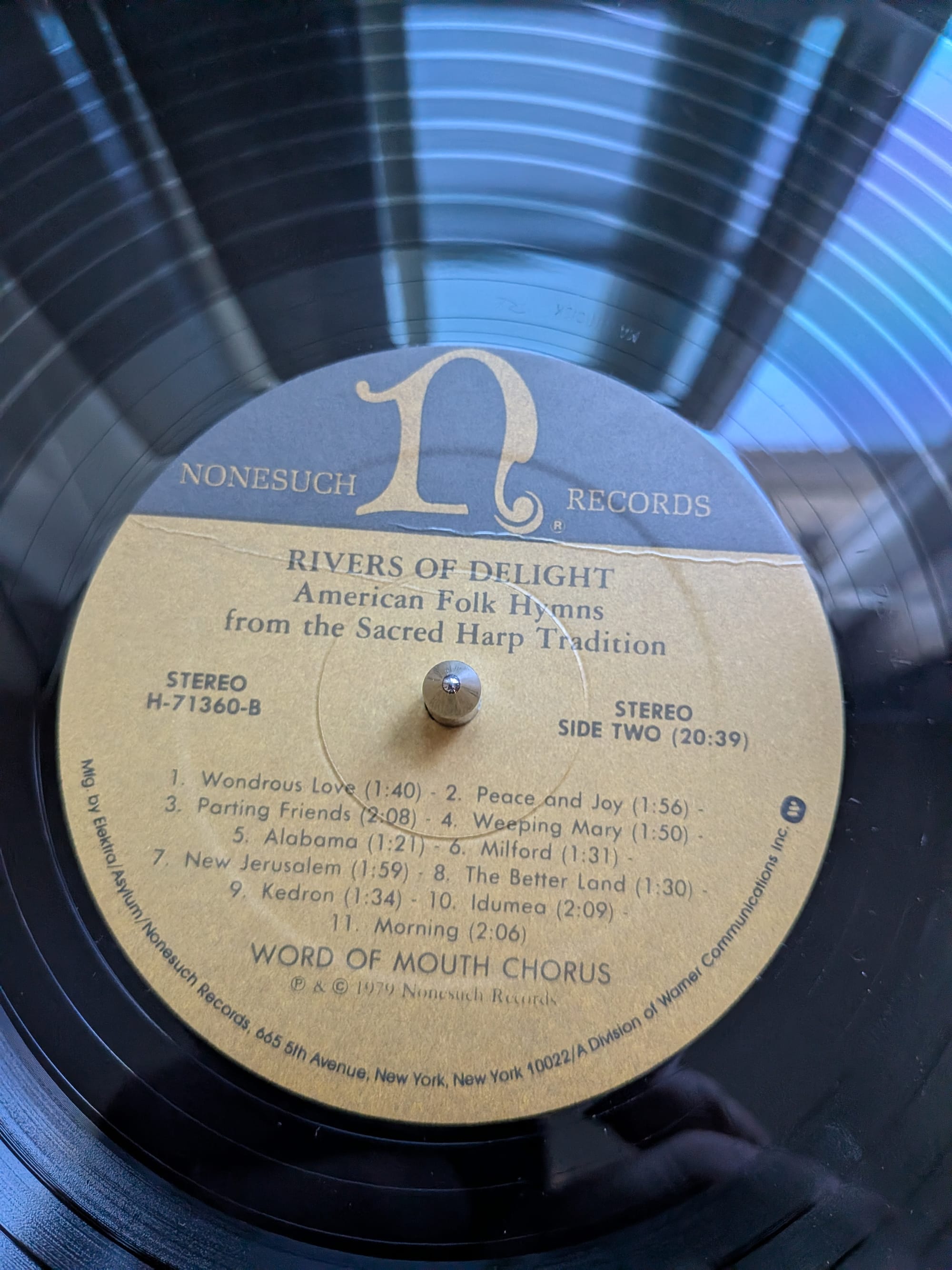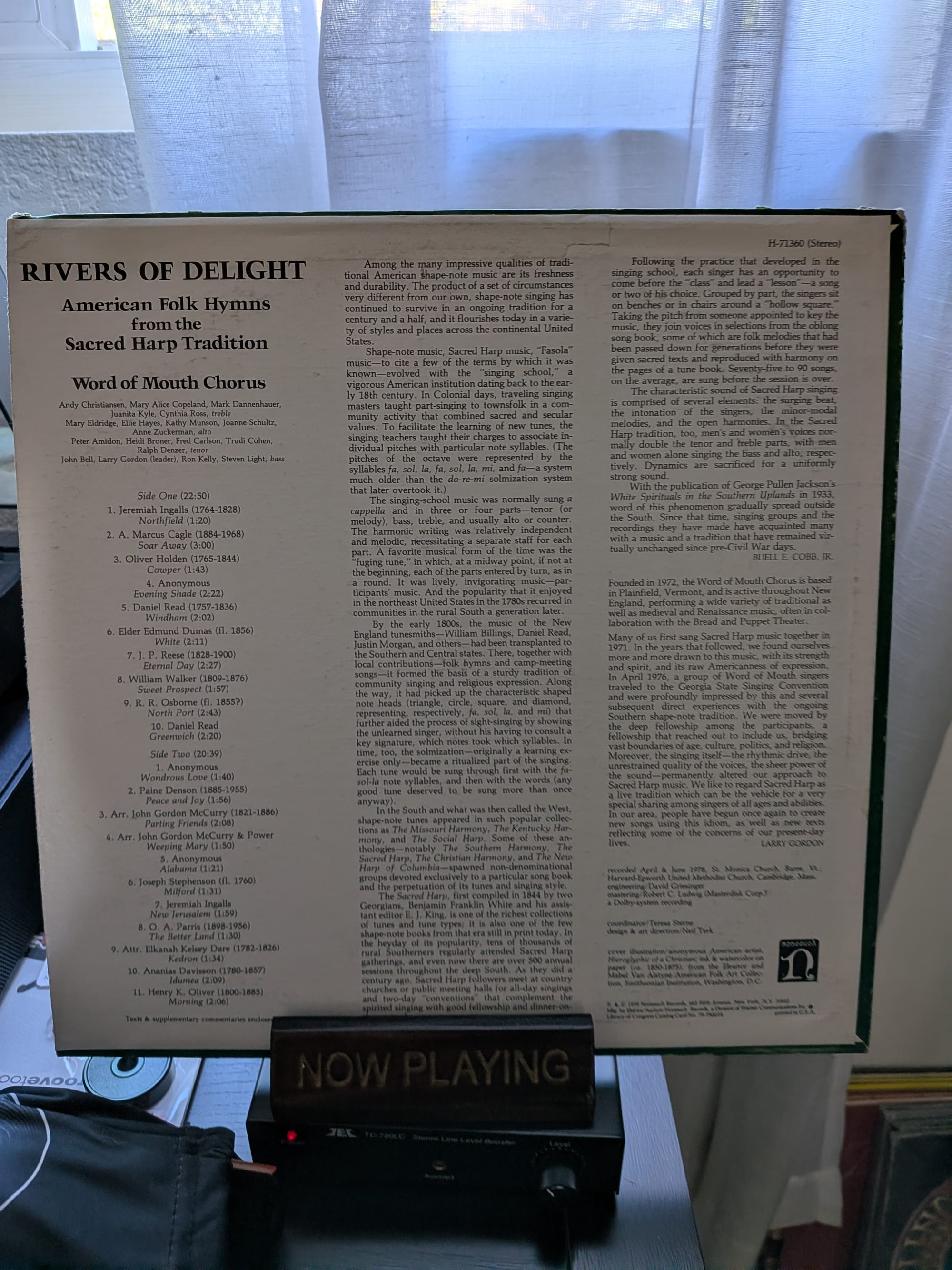 This was sitting in a stack of records I bought in the back of Vinyl Junkies, so I must've bought it there. Seems like an unusual record to find there, but I'm glad that I did. Wonderful shape-note music of early colonial America. Pairs well with Shaker Hymns, which I'll have to dig up again now.
