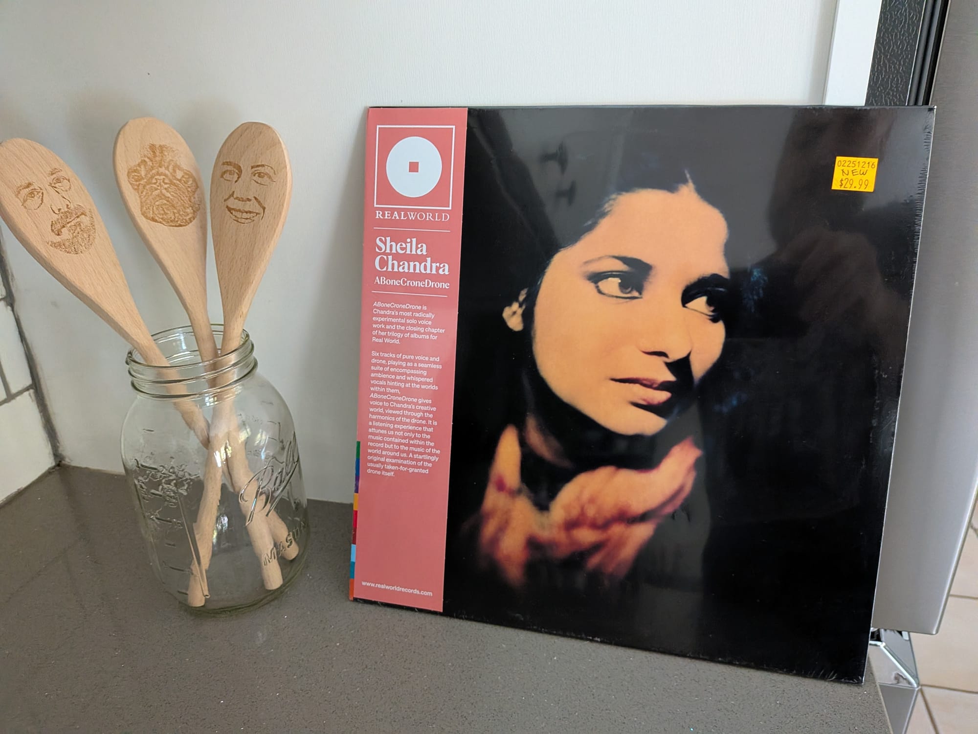 Then, to Vinyl Junkies, where I was quite proud of myself that I managed to leave well under budget and without a huge stack of records. Seeing one of my favorite artists and albums right at the checkout nearly jeopardized that, but I had to get it: Sheila Chandra's "ABoneCroneDrone". A must-have for me, and at $30, still not too bad for new vinyl